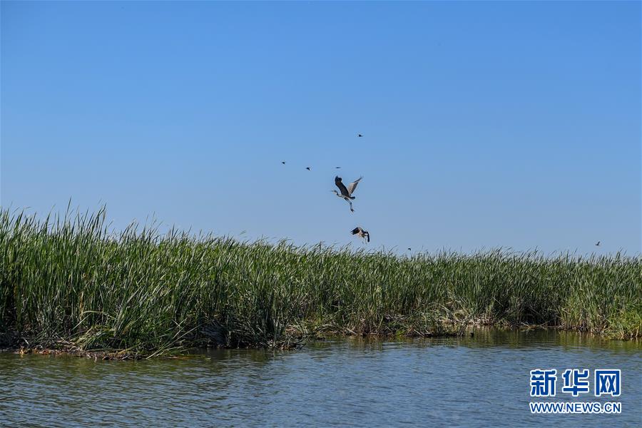 鸟类在查干湖湿地栖息(7月20日摄)。新华社记者张楠摄