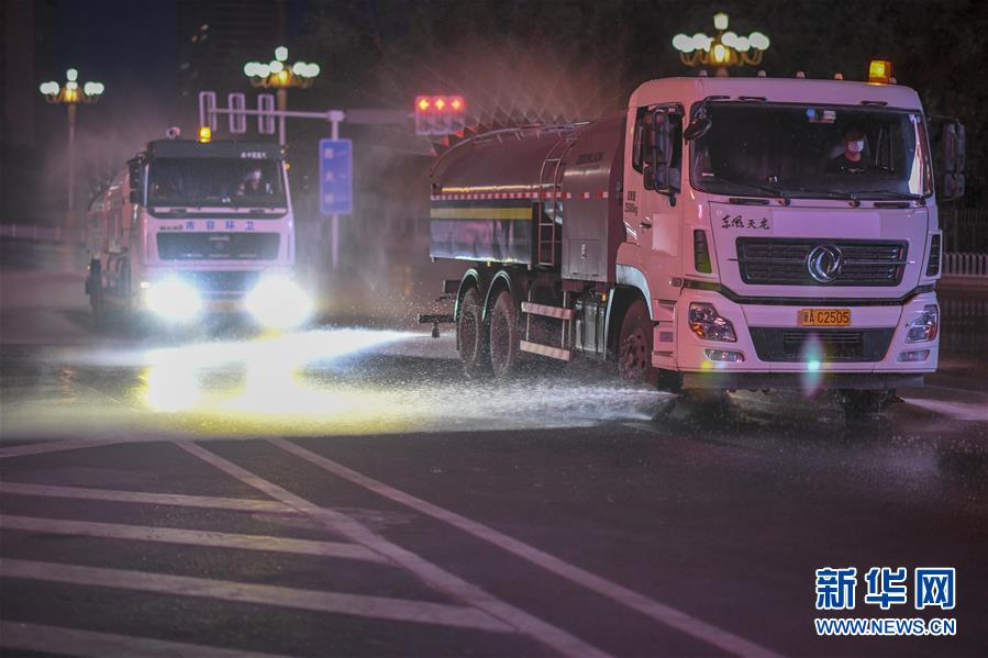 7月20日,乌鲁木齐市天山区城管局清运队的工作车辆在市区光明路附近进行消杀作业。乌鲁木齐市天山区城管局自7月17日起,对天山区的主次干道76条及235条巷道进行集中消杀。目前,乌鲁木齐市对重点区域进行全面消毒消杀。新华社记者赵戈摄