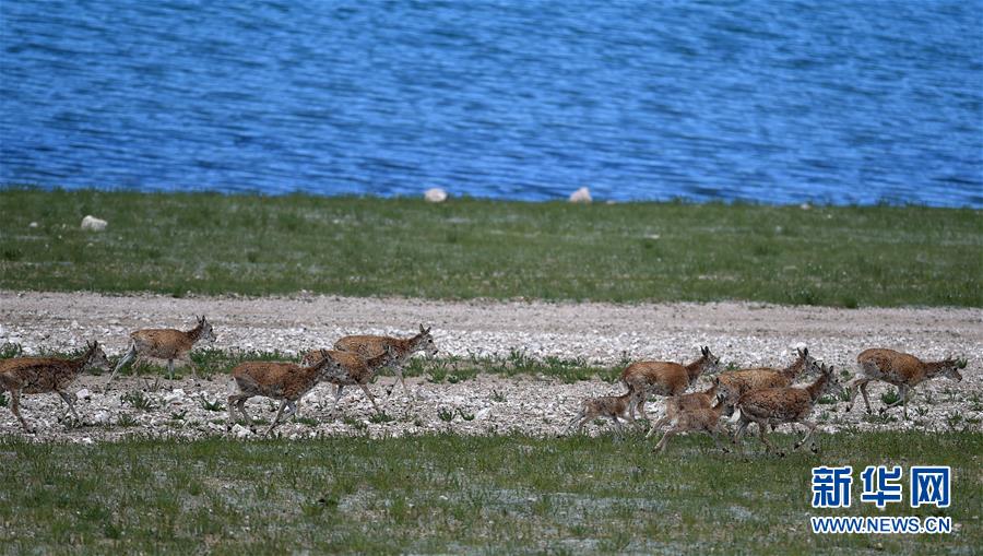 7月19日,藏羚羊群在错鄂湖旁行进。2000年,西藏羌塘自然保护区晋升为国家级自然保护区。20年来,经过西藏各级各部门的不懈努力,羌塘国家级自然保护区内的重点保护野生动物种群数量明显增加,其中,藏羚羊种群数量由原来的5至7万只,恢复到目前的15万只以上。羌塘国家级自然保护区核心地带的西藏尼玛县荣玛乡附近,目前就有近6万只藏羚羊。新华社记者觉果摄