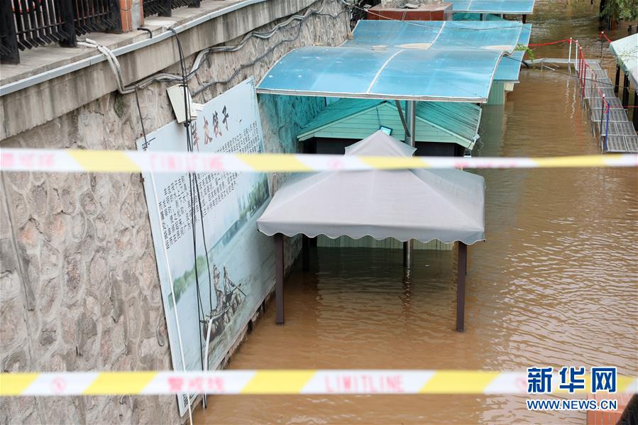 在兰州市城关区黄河兰州段南岸,被淹的羊皮筏子售票处门口拉上了警戒线(7月21日摄)。据了解,受降雨影响,黄河兰州以上来水持续增加,黄河兰州水文站7月20日20时42分流量达到3000立方米每秒,出现黄河2020年第2号洪水。新华社记者马莎摄