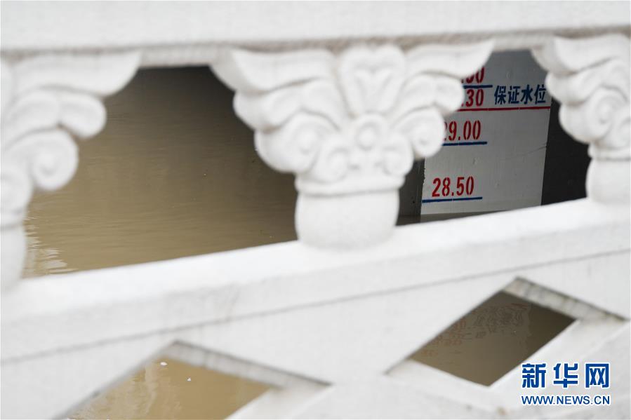 这是7月23日在安徽省阜南县拍摄的关闸后的淮河王家坝闸闸下水位。当日13时,淮河干流王家坝闸关闸,停止向蒙洼蓄洪区泄洪。新华社记者张端摄