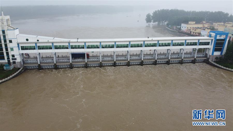 这是7月23日在安徽省阜南县拍摄的正在关闸的淮河王家坝闸(无人机照片)。当日13时,淮河干流王家坝闸关闸,停止向蒙洼蓄洪区泄洪。新华社记者张端摄