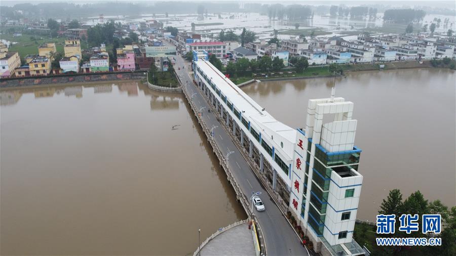 这是7月23日在安徽省阜南县拍摄的关闸后的淮河王家坝闸(无人机照片)。当日13时,淮河干流王家坝闸关闸,停止向蒙洼蓄洪区泄洪。新华社记者张端摄