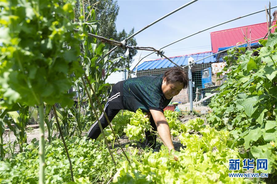 7月23日,在黑龙江省抚远市浓桥镇东方红村,康丽艳在自家庭院中摘菜。新华社记者 谢剑飞 摄