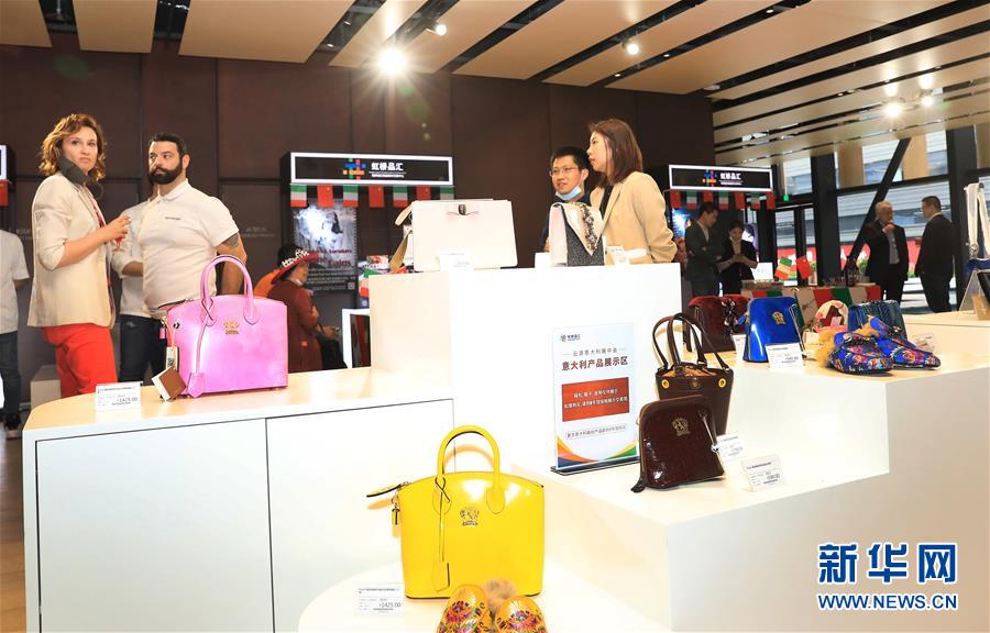 2020年5月8日,虹桥品汇国别文化节云游意大利主题展在上海虹桥进口商品展示交易中心举行,参观者从展览上一个意大利皮具展示台前走过。新华社记者 方喆 摄