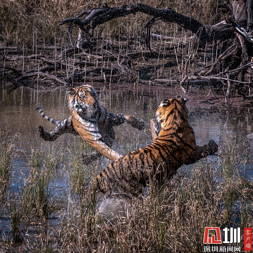 2020年7月27日,猛虎斗有多壮观?来自印度德里的41岁职业业摄影师Nitish Madan,在在印度北部伦滕波尔国家公园游览时,见证了两只老虎幼崽激烈的水上争夺战。从画面中可以看到,两只足足有200磅重的孟加拉虎,面对面互相咆哮,伸出虎爪凶猛至极,才15个月大就已经有了王者风范。