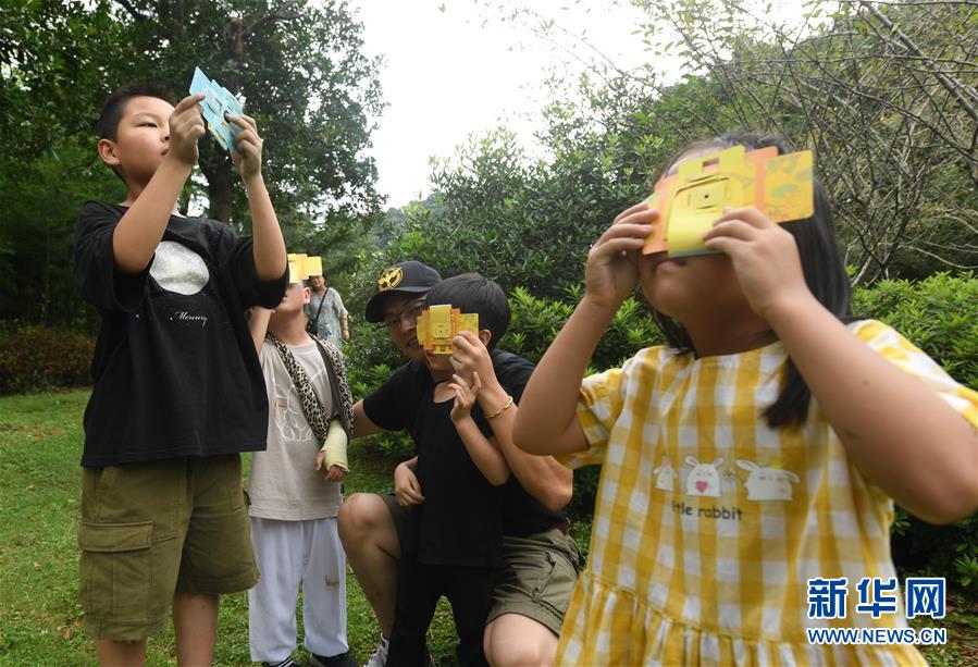 7月27日,小朋友们用自制的便携显微镜观察树叶。新华社记者 翁忻旸 摄