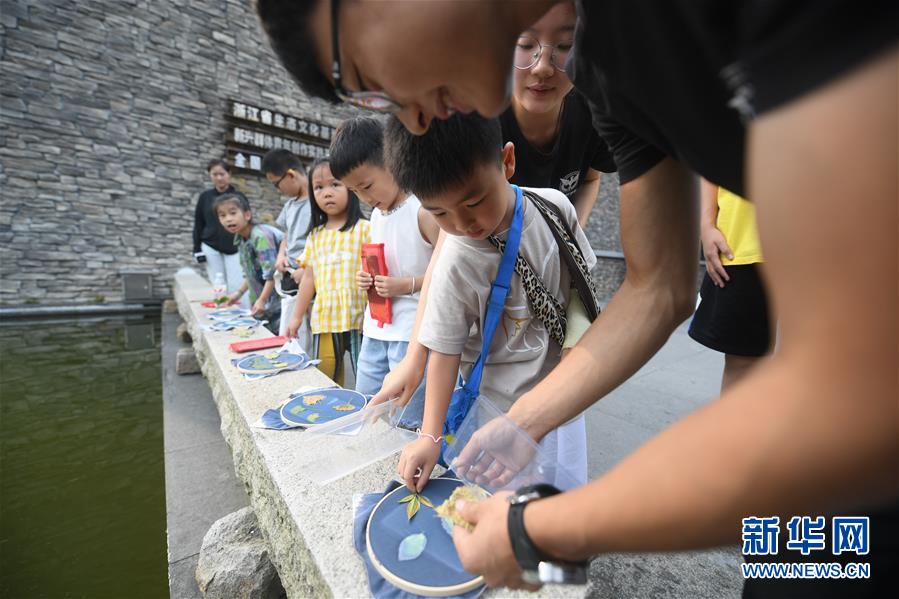 7月27日,小朋友们用树叶制作蓝染。新华社记者 翁忻旸 摄