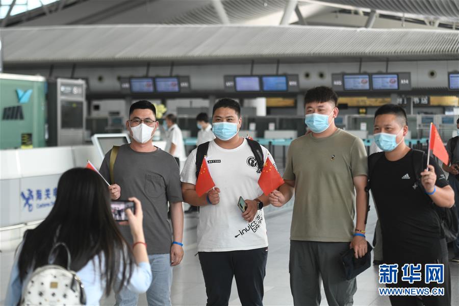7月29日,在杭州萧山国际机场,电力工程技术人员在进入安检通道前合影。当日,中国能源建设集团浙江火电建设有限公司的113名电力工程技术人员在杭州萧山国际机场集结,启程飞赴印度尼西亚首都雅加达。他们将重新投入到印尼多个“一带一路”重点工程的建设中。新华社记者黄宗治摄