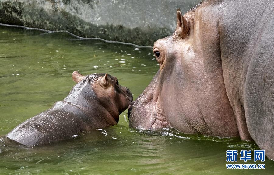 北京动物园的河马母子在恒温水池内乘凉(7月30日摄)。炎炎夏日,北京动物园根据动物生活习性,为动物配备了自动喷淋喷雾、空调笼舍、恒温水池、遮阳棚等各类避暑设施,同时还准备了西瓜等降温食品,保障动物平安舒适地度过伏天。新华社记者李欣摄