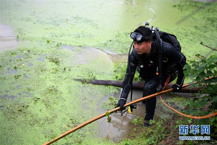 7月24日,在安徽省庐江县台创园小南河段,吴正宝下水前清理水上杂物。新华社记者刘军喜摄
