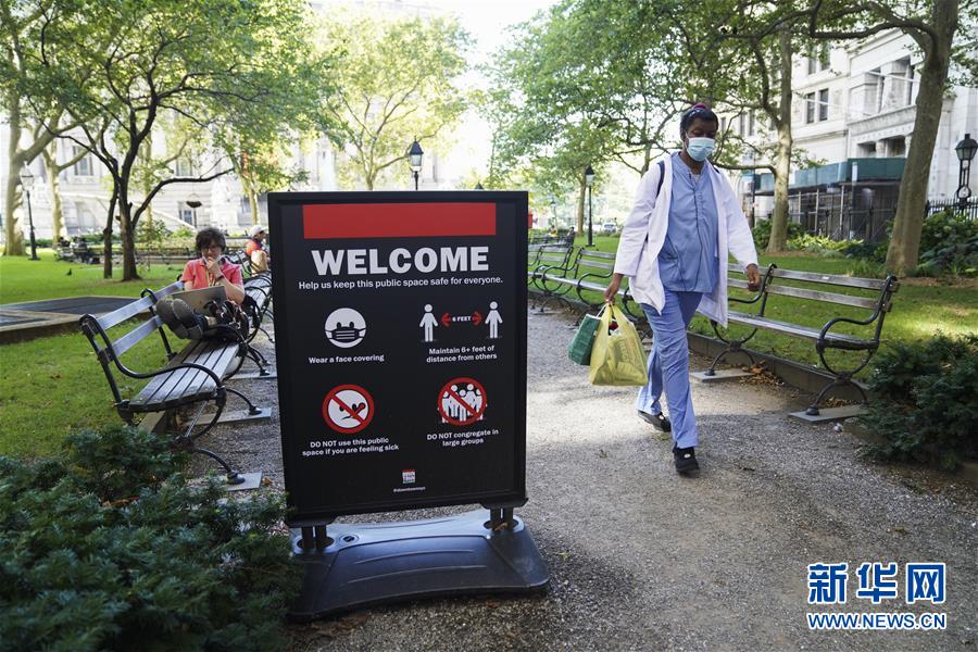 7月29日,在美国纽约,一名女子从公园内的防疫提示牌旁走过。美国约翰斯·霍普金斯大学实时统计数据显示,截至29日,美国累计新冠确诊病例已超过440万例,累计死亡病例超过15万例。新华社记者王迎摄