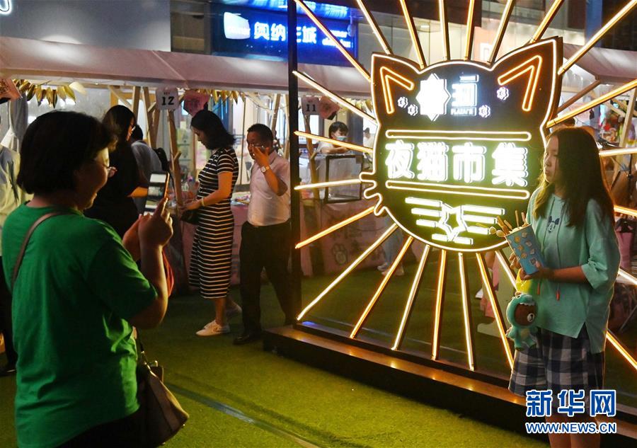 在“夜猫市集”入口处,人们在拍照留念(7月29日摄)。