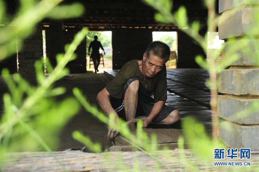 7月30日,河北省任丘市出岸镇古建砖厂工人在制作砖坯。新华社记者牟宇摄