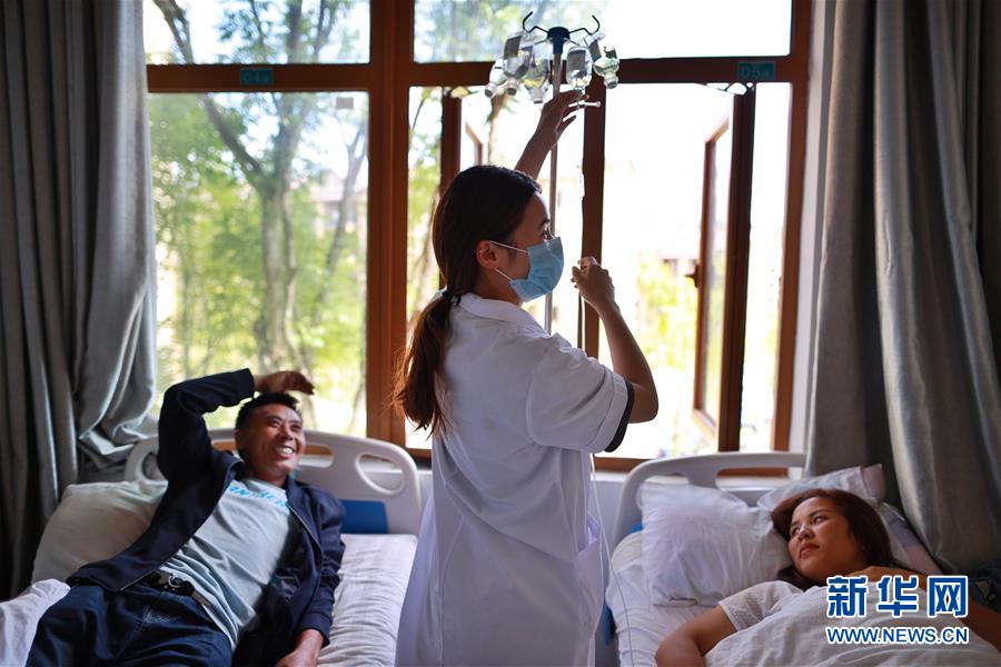 搬迁群众在柏杨林易地扶贫搬迁安置点卫生院内治疗(8月3日摄)。贵州省毕节市七星关区柏杨林易地扶贫搬迁安置点是毕节市最大的易地扶贫搬迁安置点,总面积约1.1平方公里,从2017年开始至今,共有34个乡镇6372户29001人安置到位。如今,安置点内教育、医疗、就业扶贫车间、长幼日间托养照料中心等设施齐全,搬迁群众在这里过上了安居乐业的幸福生活。新华社记者刘续摄