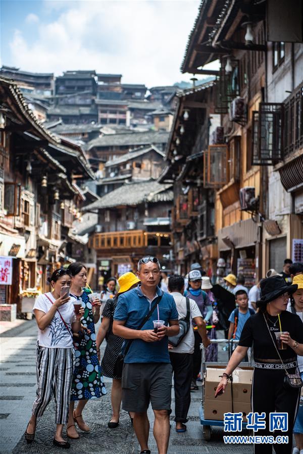 游客在贵州省雷山县西江千户苗寨景区内游玩(7月31日摄)。新华社记者陶亮摄