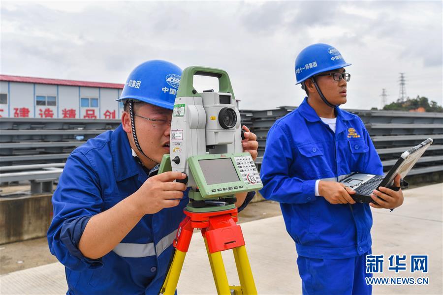 8月5日,中铁十一局技术人员在清远磁浮轨排基地对试验梁轨排进行精调。目前,广东首条中低速磁浮线——清远磁浮旅游专线项目建设有序推进。广东清远磁浮旅游专线项目全长约38公里,分两期建设。首期全长8.014公里,将在9月份开始铺轨,预计在2020年底实现主体工程全面完工。新华社记者刘大伟摄