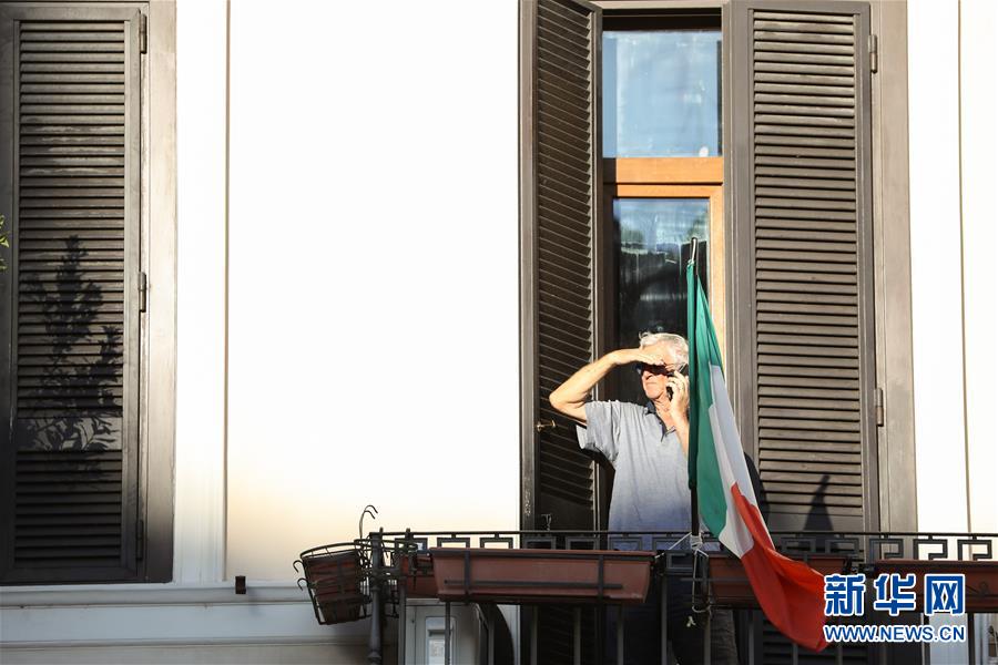 8月4日,在意大利首都罗马,一名男子在阳台打电话。受新冠疫情影响,今年夏天罗马的历史中心区游客比往年明显减少。新华社记者程婷婷摄