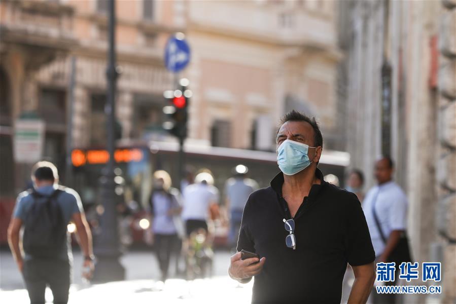 8月4日,一名男子戴着口罩走在意大利首都罗马街头。受新冠疫情影响,今年夏天罗马的历史中心区游客比往年明显减少。新华社记者程婷婷摄