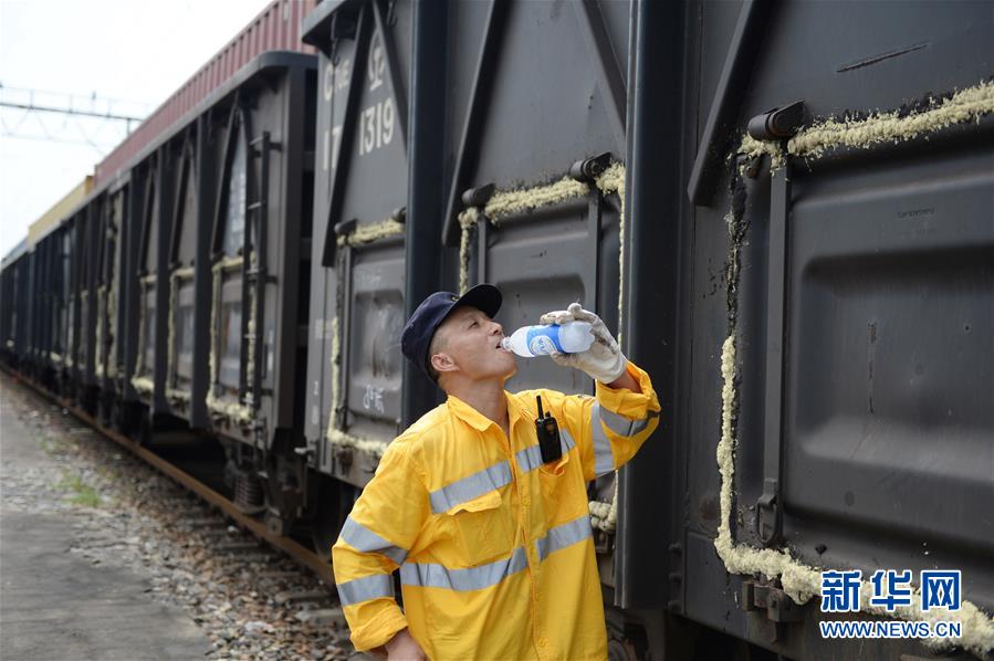 8月6日,合肥运用车间列车检修员在工作间隙喝水。合肥市近日持续高温天气。在中国铁路上海局集团有限公司杭州北车辆段合肥运用车间,386名列车检修工人头顶烈日坚守岗位,确保暑运列车的安全运行。据了解,暑运期间,合肥运用车间日均检修列车105列,检修车厢5058节。新华社记者黄博涵摄