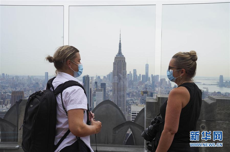 8月6日,在美国纽约,人们在洛克菲勒中心观景台上观看城市景观。当日,3月份暂时关闭的洛克菲勒中心观景台恢复对公众开放。每天13时至21时,人们可戴口罩前往参观。新华社记者王迎摄