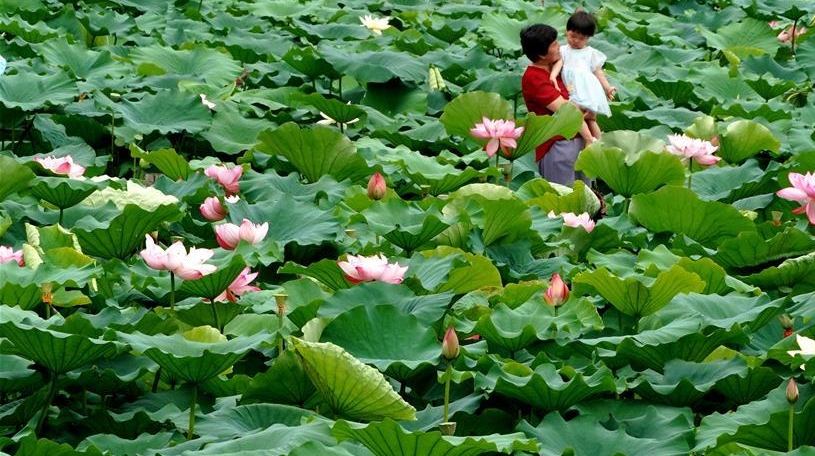 近日,河南郑州紫荆山公园内的荷花陆续绽放,吸引大批市民和游客前来观赏。