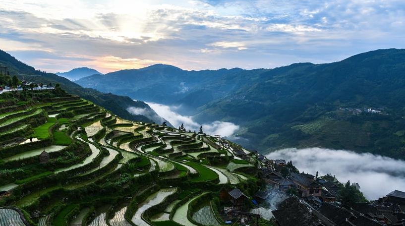 夏日时节,位于贵州省黔东南苗族侗族自治州从江县加榜乡加车、加页、党扭等苗寨的梯田在晨雾与阳光的映衬下线条分明,光影变幻,景色如画。
