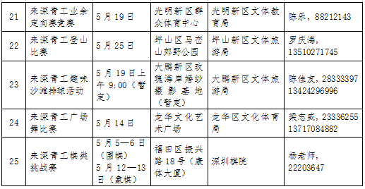 为便于更多青工了解、报名参与此次文体节,活动主办及承办单位不但将通过多媒体渠道广泛传播,还将在深圳市文体旅游局官方网站(http://www.szwtl.gov.cn/)、深圳数字文化馆(https://www.szmassart.com/)、“深圳公共文化”微信公众号、“深圳市文化馆”微信公众号陆续发布活动各项信息。