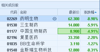 智通财经APP获悉,受产业政策影响,医药股普跌,药明生物(02269)领跌板块,连续三个交易日下挫,跌逾两成。截至10时26分,跌8.33%,报价62.75港元,成交额2.27亿。