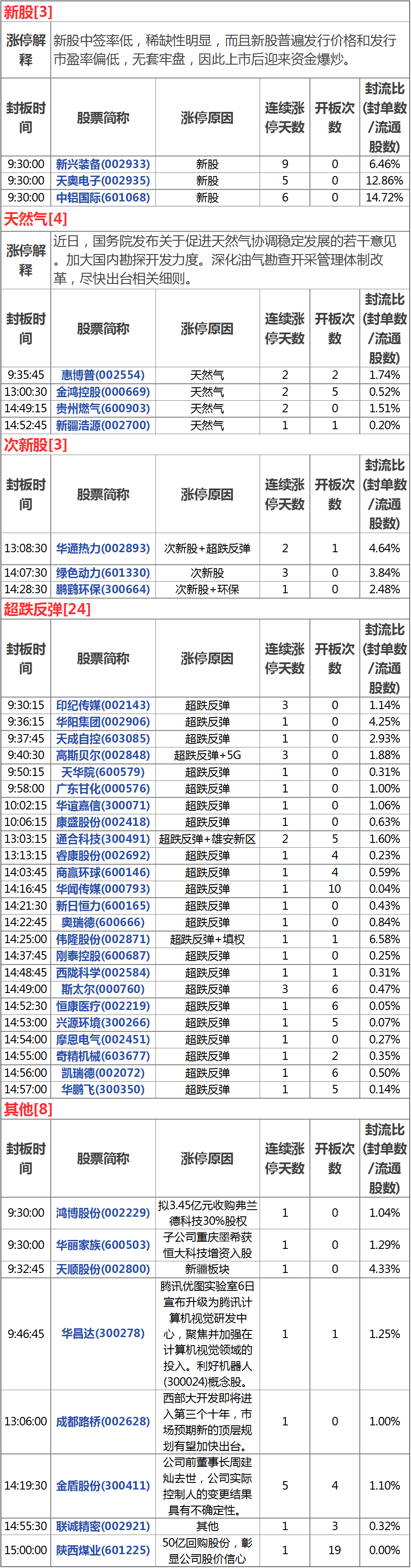 今天涨停家数较上一交易日有所增加,两市共42家涨停;跌停6家。成交量方面,沪市成交1138亿元,深市成交1582亿元,两市总成交额约为2720亿元,较上一交易日放量224亿。盘面上燃气水务、黄金、煤炭等板块涨幅前;电子发票、国产软件、芯片等板块跌幅居前。