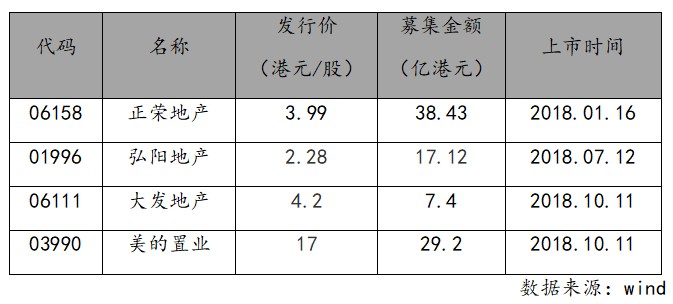 10月11日,大发地产(06111.HK)、美的置业(03990.HK)同时在港交所成功挂牌上市,加上此前于1月份上市的正荣地产(06158.HK),7月份上市的弘阳地产(01996,HK),2018年港股上市内地房地产企业增至四家