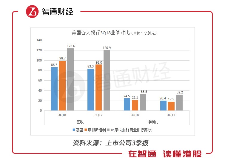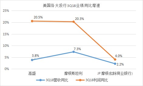 三家投行的3Q18营收增速在所有上市公司中排名靠后,从营收和利润的同比增速来看,JP摩根都是排名垫底,高盛和“大摩”的利润增速都超过20%,大大超过利润增速。