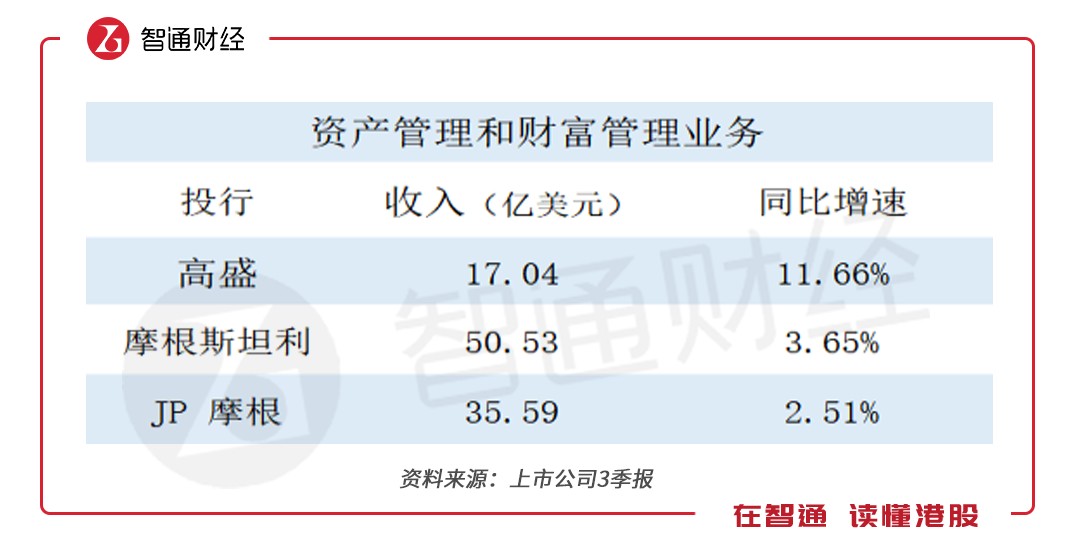 由于JP摩根有大部分营业收入来自商业银行的业务,而高盛和摩根斯坦利则几乎没有。为了更有针对性地对比,智通财经APP只统计JP摩根中的“公司和投资银行”和“资产和财富管理”这两个板块业务的数据。