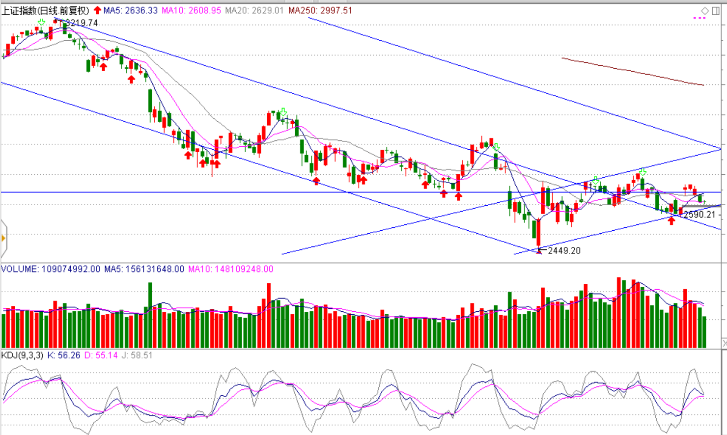 经过持续几天缩量调整,短期调整空间有限,窒息量结构后如配合成交量放大则视为短期企稳信号,关注沪综指2575点、创业板1326点一线支撑,预计本周企稳回升。
