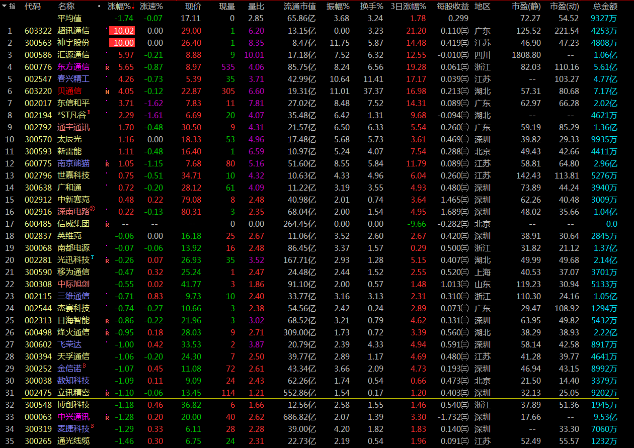 超乎寻常的顽强,早盘竞价除东方通信(600776)与超讯通信(603322),板块近乎全军尽殁,但开盘后泰永长征(002927)、东方通信(600776)快速上拉,超讯通信(603322)封死一字板,给了市场短线资金信心,抄底盘开始进场,板块开始迅速上攻。从今天早盘的表现看,5G板块资金介入程度颇深,后续应重点关注。