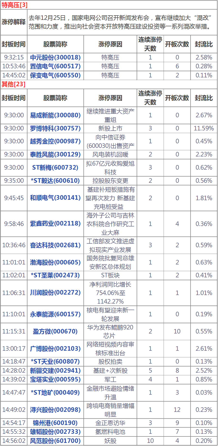 今天涨停家数较上一交易日有所减少,两市53家涨停;跌停5家。成交量方面,沪市成交1327亿元,深市成交1807亿元,两市总成交额约为3134元,较上一交易日缩量658亿元。盘面上,光伏、5G、特高压等板块涨幅居前,券商、超导、高铁等板块跌幅居前。