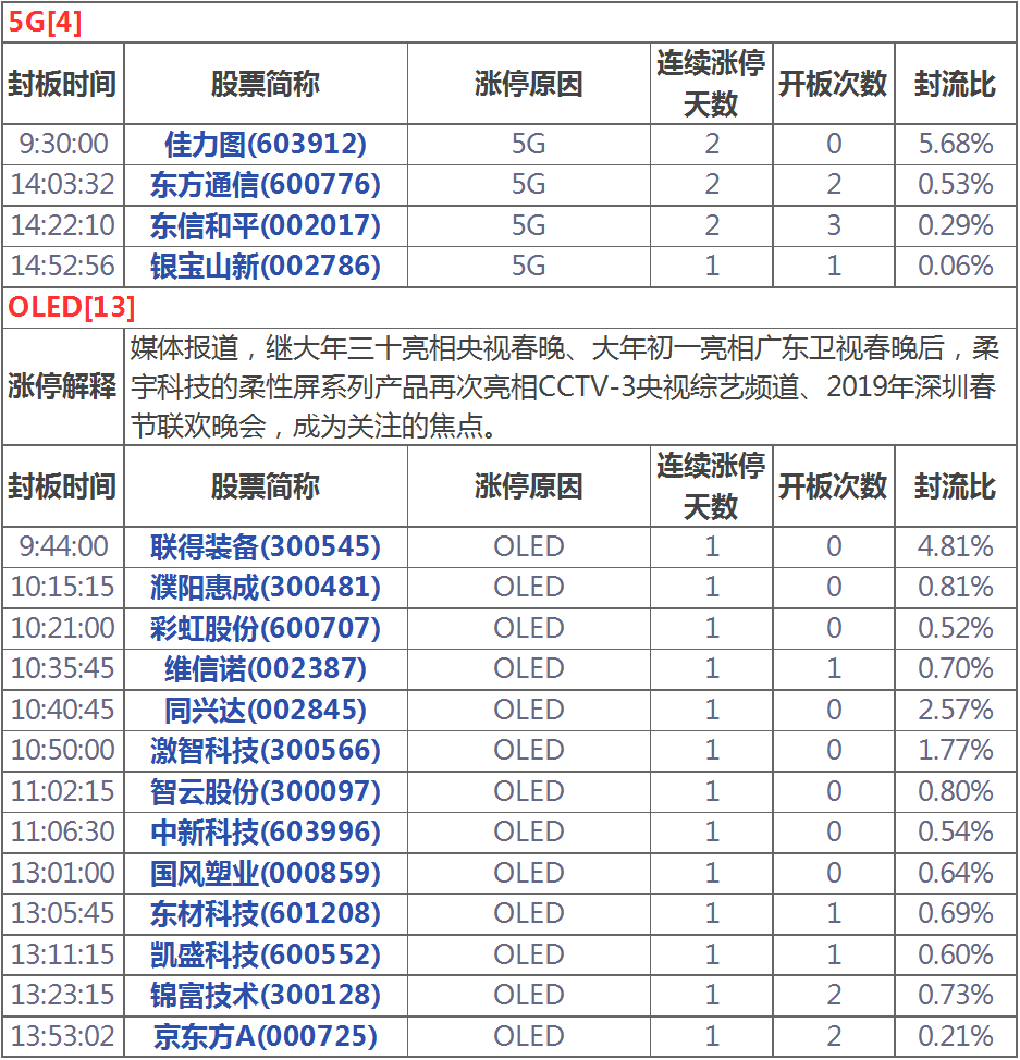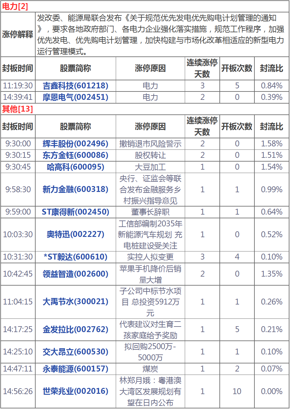 今天涨停家数较上一交易日有所减少,两市75家涨停,跌停1家。成交量方面,沪市成交1567亿元,深市成交2085亿元,两市总成交额约为3652元,较上一交易日放量453亿元。盘面上板块普涨,OLED、医药、天津自贸区、氟化工等板块涨幅居前。