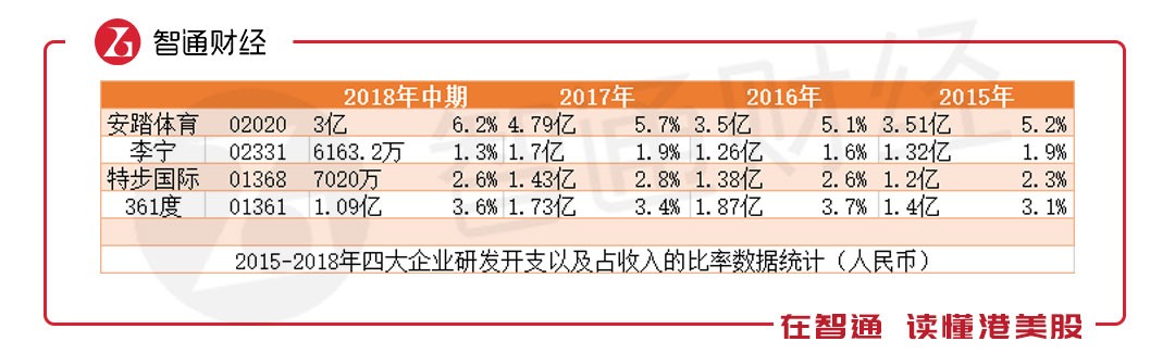 从2015-2018年中期,李宁的研发支出一直是国内四大体育用品企业中最低的。以2018年上半年为例,李宁的研发支出为6163.2万元,占当期收入的比率仅为1.3%,而安踏研发支出高至3亿元,就连特步、361的研发支出比率都高于李宁。