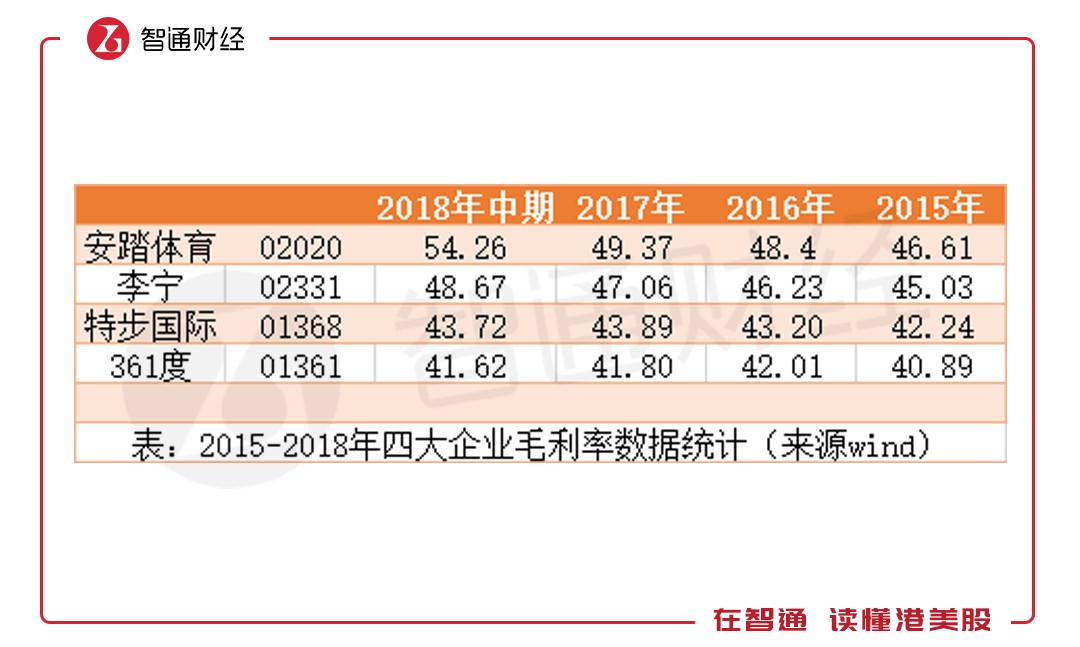 与存货周转率一起稳步增长的,还有毛利率,从2015年的45.03%上升至2018年上半年的48.67%。但与安踏一比,差距就出来了。2015年时,双方的毛利率差距仅1.58个百分点。但随着安踏规模的扩大,规模响应逐渐体现,李宁与安踏的毛利率差距加大,2018年上半年时,差距扩大至5.59个百分点,但李宁毛利率仍高于特步和361。