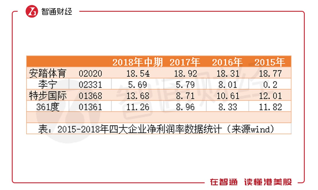 然而,高毛利优势并未在利润中体现。2015年时,李宁的净利润率为0.2%,2016年时上升至8.01%,2018年上半年时,安踏、特步、361的净利润率分别为18.54%、13.68%、11.26%,均远高于李宁的5.69%。