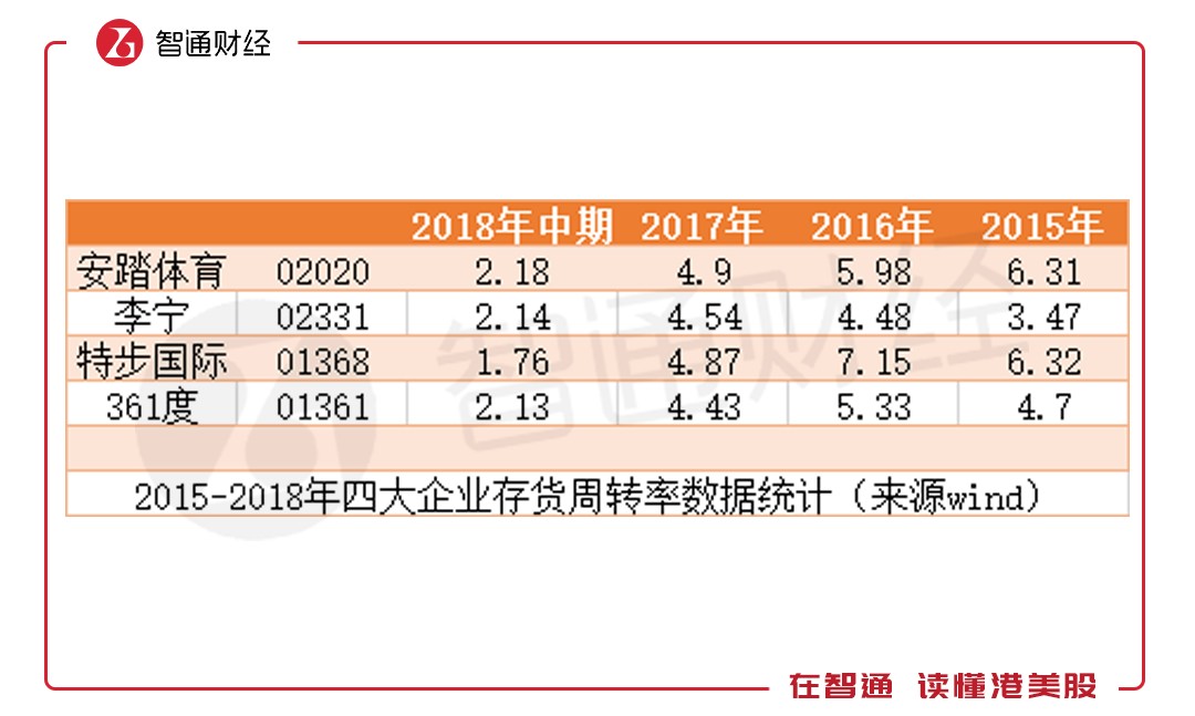 2015年时,李宁虽扭亏为盈,但在存货周转率上,与竞争对手仍相差较远。李宁当时的存货周转率仅3.47次,而安踏体育(02020)为6.31次,特步国际(01368)为6.32次,连361度(01361)也有4.7次。