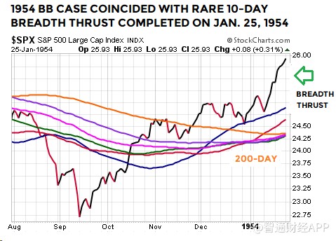 1954年1月25日时的广量冲力指标如下图所示,在4个交易日前,布林通道月线图出现前述形态。与2019年相似的是,当时的点位接近200日均线的水平:
