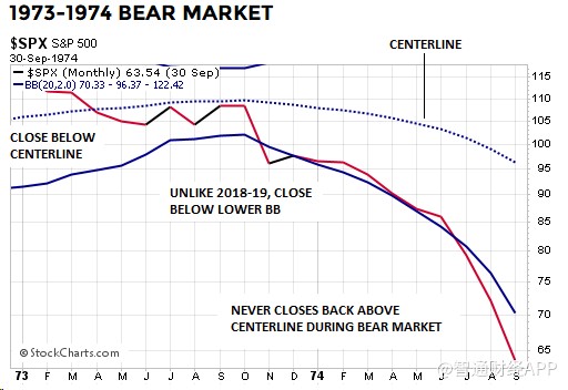 下图是1973-74年时的情形,标普500指数在整个熊市期间都无法重新回到布林通道中轨之上。与2019年(即到目前为止)不同的是,1973年11月标普500指数收于下轨以下: