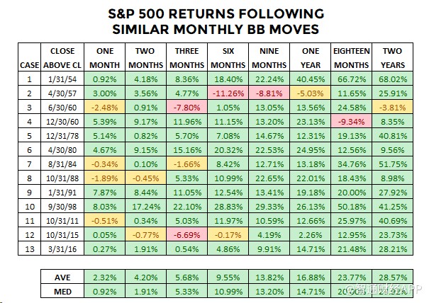 追溯到1950年,标普500指数的月线图出现过13次相似的走势。如下表所示,在这一形态出现后的两年里,股市基本上一直走牛: