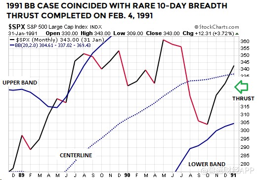 上述布林通道技术形态属较为罕见的类型。值得注意的是,1954年和1991年时的另一技术指标,广量冲力指标,基本上与2019年1月21日出现的广量冲力指标形态类似。因此,在1954年、1991年和2019年,标普500指数走出了布林通道及广量冲力指标都相似的技术形态。