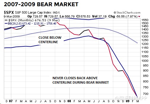 在2007年10月股市见顶之后,标普500指数在2008年1月收于布林通道月线中轨以下,在熊市期间都无法重新回到布林通道中轨以上。2008年6月标普500指数收于下轨以下: