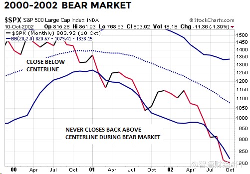 2000-02年熊市也是如此,标普500指数在2000年第四季度跌破中轨以后,就无法重新回到布林通道中轨之上。如下图所示,第四季度之后情况进一步恶化。2001年2月标普500指数收于下轨以下: