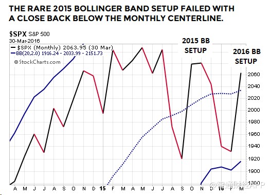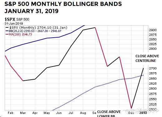 下图显示了标普500指数1月31日收于布林通道月线中轨上方。标普500指数在12月收于中轨以下,但在1月份便开始反弹,并成功回到中轨以上: