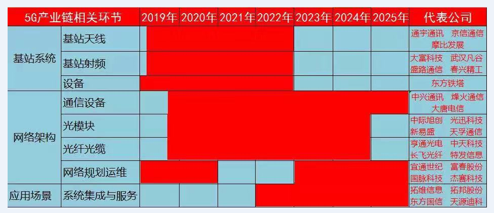 5G产业链受益周期及相关公司: