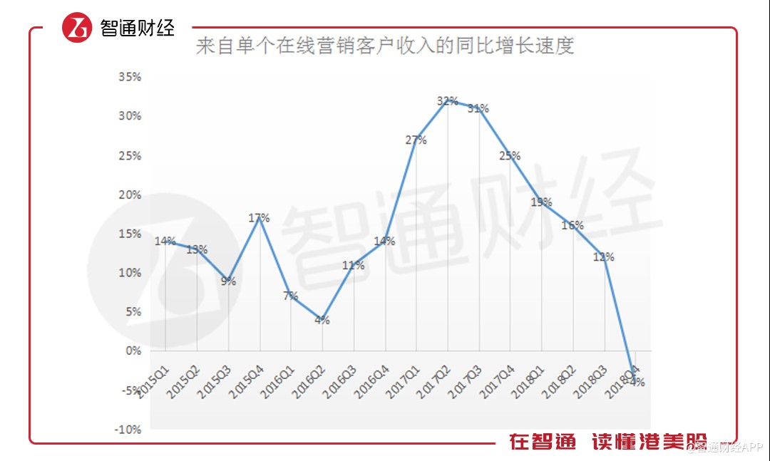 在连续下滑5个季度后,至2018年第四季度时,单个在线营销客户收入同比下滑4%,是2015年以来的首次负增长。而四季度在线广告收入同比增长10%主要是因为在线营销客户数量的增加。财报中表示,第四季度时,公司的在线营销客户为52.9万名,同比增长15%。